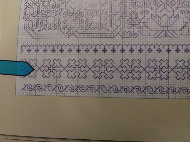I selected the following pattern from Blackwork Made Easy as it is very geometric and I like how it tesselates.