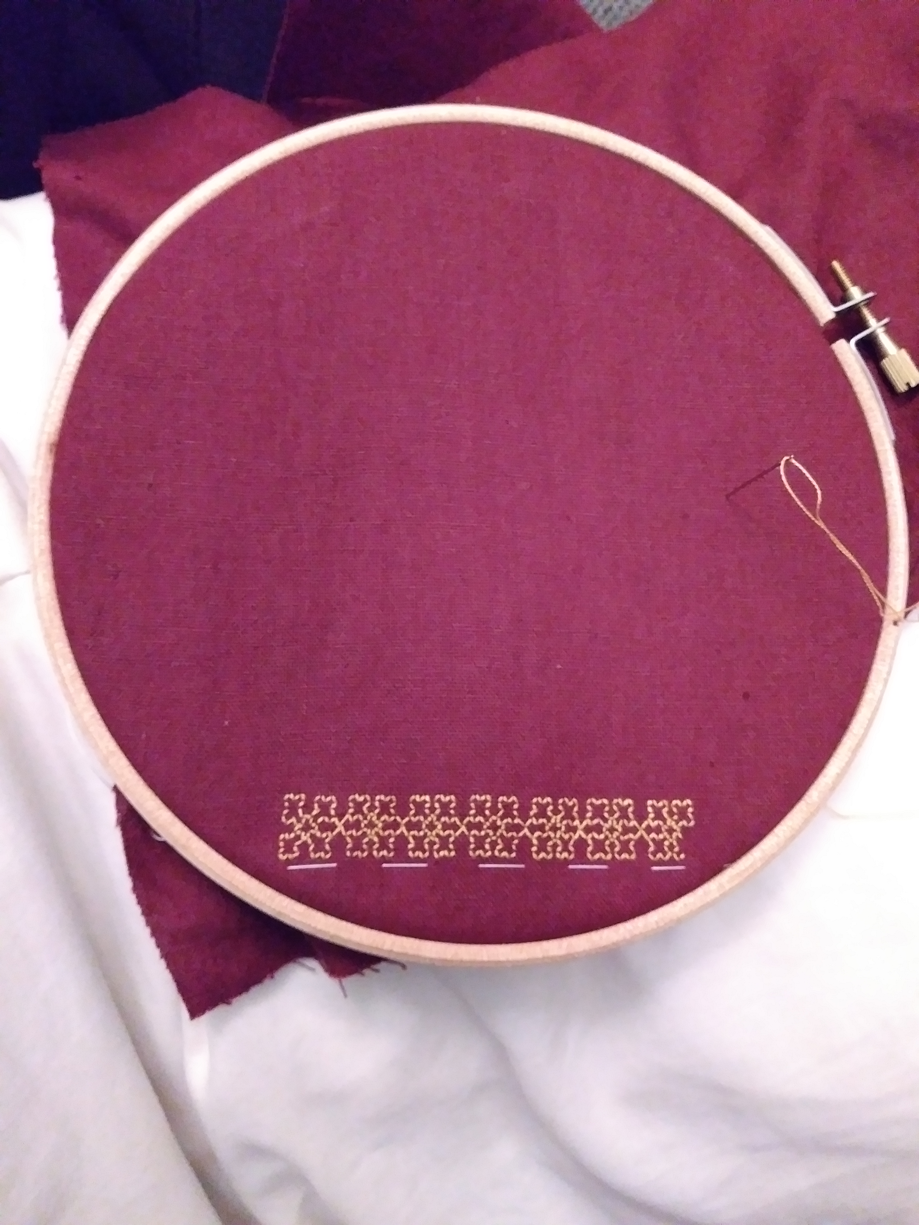 I decided it made the most sense to do the “blackwork” embroidery before sewing everything together. Blackwork is in quotes as I am not using black and I was informed by a rather entitled and slightly obnoxious lady at the shop that it’s only true blackwork if both sides are the same. I can’t be bothered to do that and it was slow enough as is.