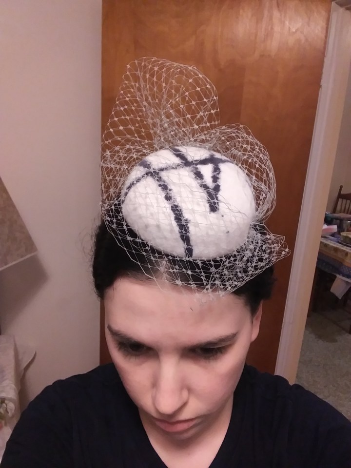 Hat #2 has veiling, still waiting for rooster feathers from the internet.