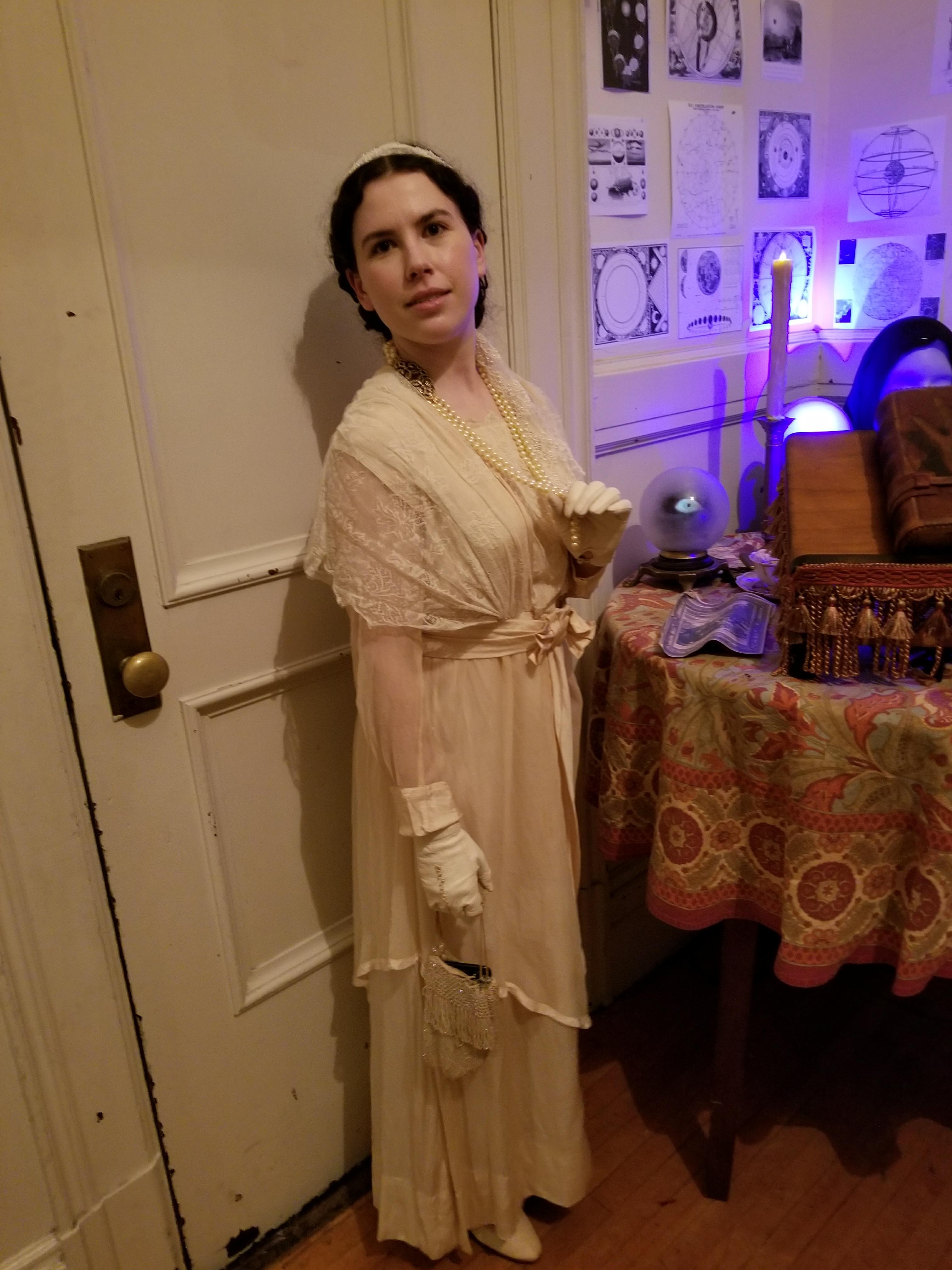 Other than being really paranoid about damaging the dress (which didn’t happen) I’m super pleased with this. It was very comfortable and a nice change from Dickens where I was wading through crowds in a crinoline. Wearing white was also a good idea as it made me easier to spot. I got quite a few compliments from people who recognized me as being in correct period even though that’s not really the point of Edwardian ball.