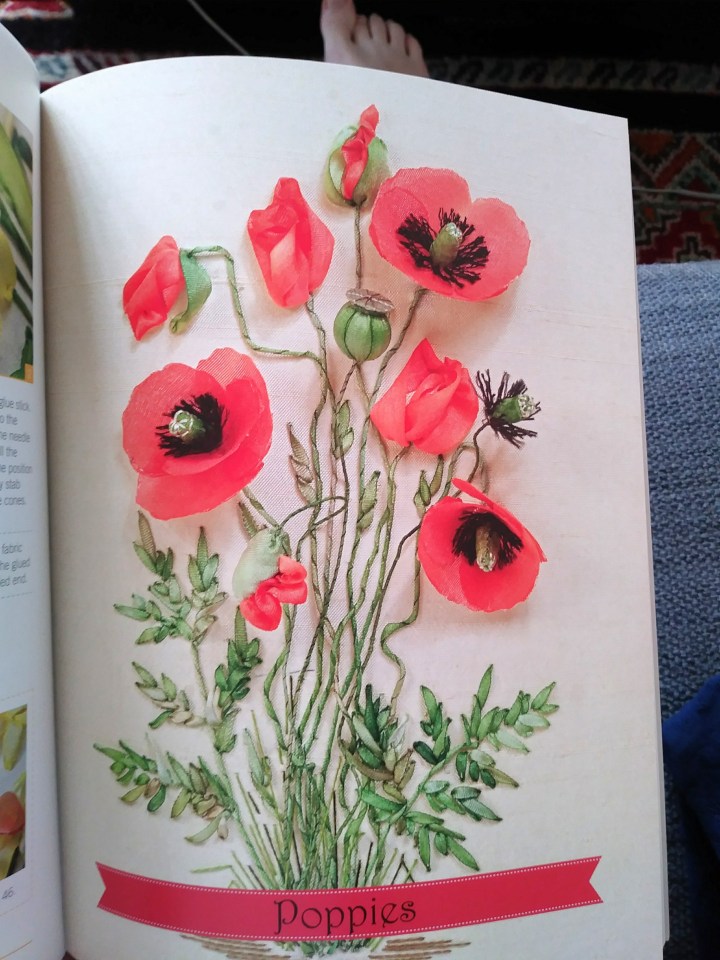 From this book, which is full of fabulous and original ribbon embroidery designs. Some of the designs I’ve seen can be a bit….mumsy… but these are all beautiful