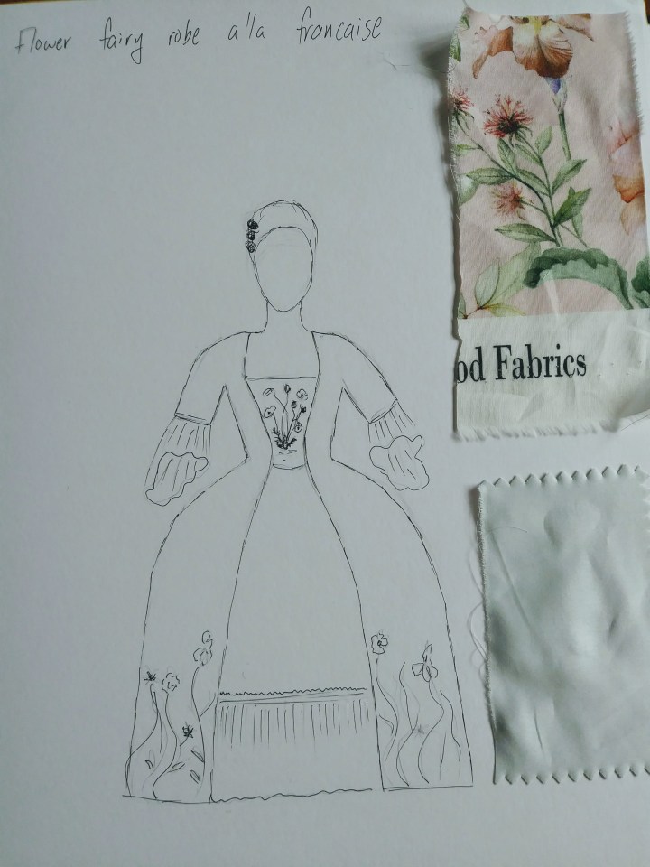 The stomacher/petticoat is a subtle pale blue-grey cotton shirting with some sheen. The main fashion fabric is arranged so that the flowers grow up from the hem. There is no self-fabric trim other than a deep ruffle on the petticoat.