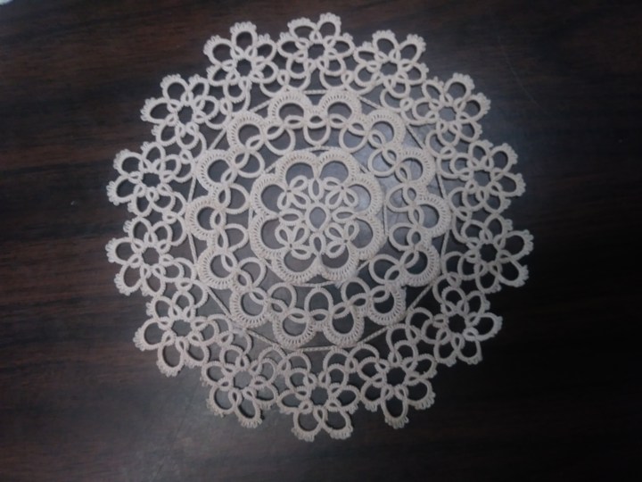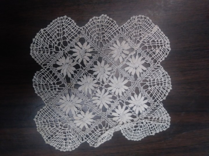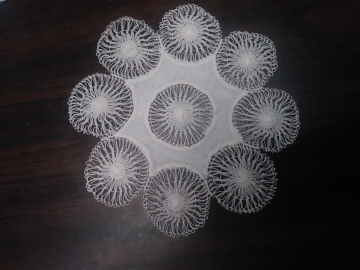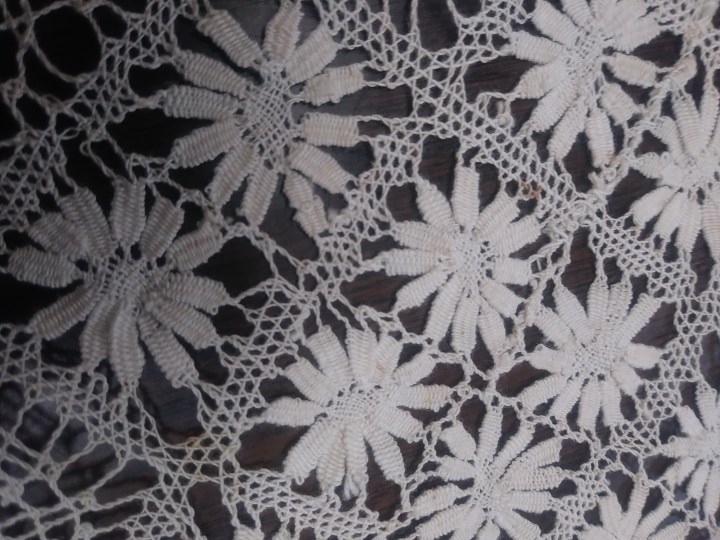 Teneriffe. The most spidery lace, this is always made up of medallions joined together. It’s made by interweaving thread on a circular grid and then anchoring them in place.