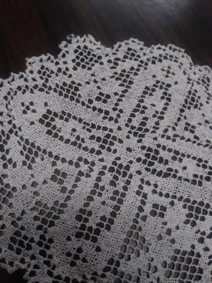 Filet. The most pixelated lace form. Hand-made filet is on a knotted net and each square interwoven.
