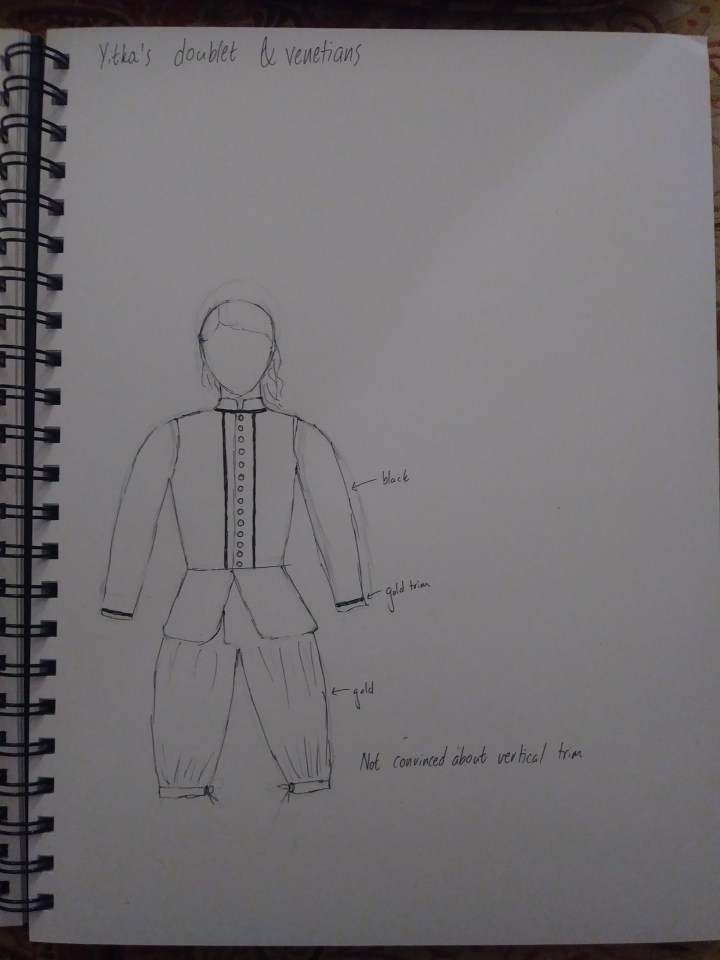 Her knight’s colors are black and gold and she has pale skin, brown hair and blue eyes so I went with gold venetians and a black doublet with gold trim. If she’s happy with these I might make another doublet in dark green because I think it’ll look great on her.
