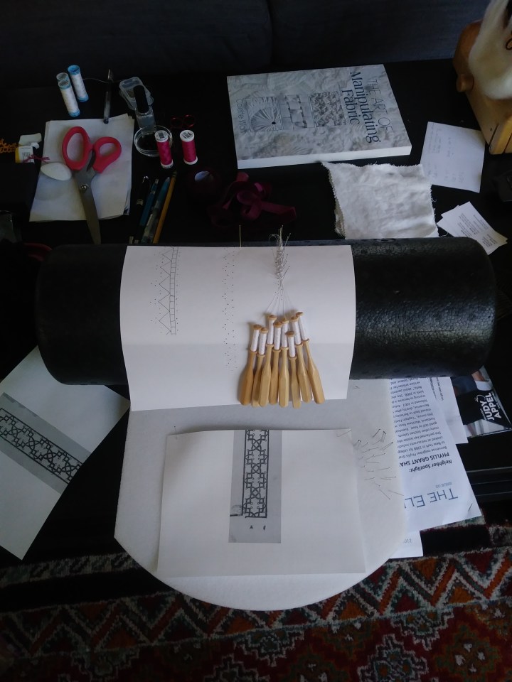 Yes, I made a super sketchy roller pillow out of my spare foam roller. It actually works. I’m as surprised as anyone. The lace is a double/triple picot that’s going to go on the neck and cuffs of my 1520s chemise in some Gutermann silk thread I bought when I first started my Nyx costume three years ago and still was going to make the skirt ivory habotai instead of white crepe de chine.