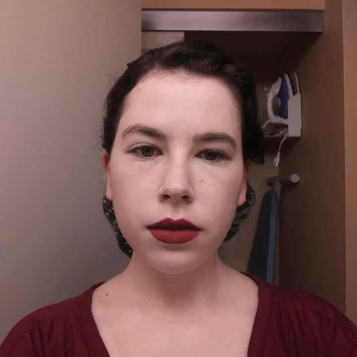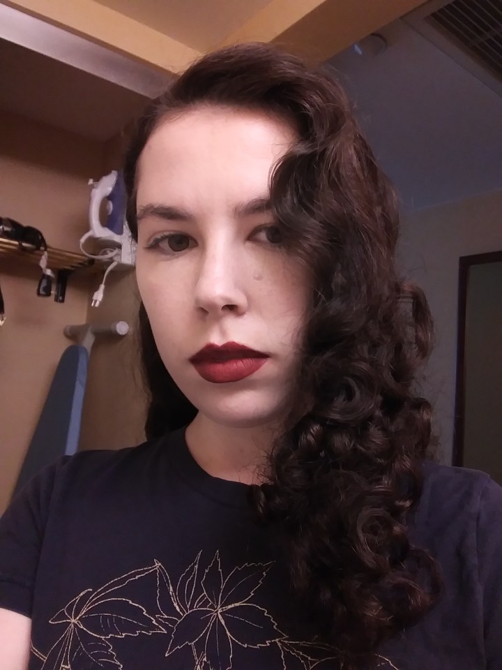 Good timing, though, because my corselette was starting to drive me nuts. I lost the dress, stockings, hair, and make-up, but not before I had a fun Veronica Lake moment!