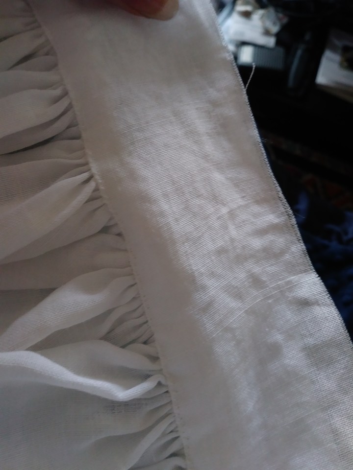 Yes, that is a ruffle enclosed in a collar. Then there is going to be another ruffle attached to the TOP of the collar. Instead of doing the sensible thing of hemming the top edge, gathering about an inch down, and applying a band over the pleats to hold them in place.