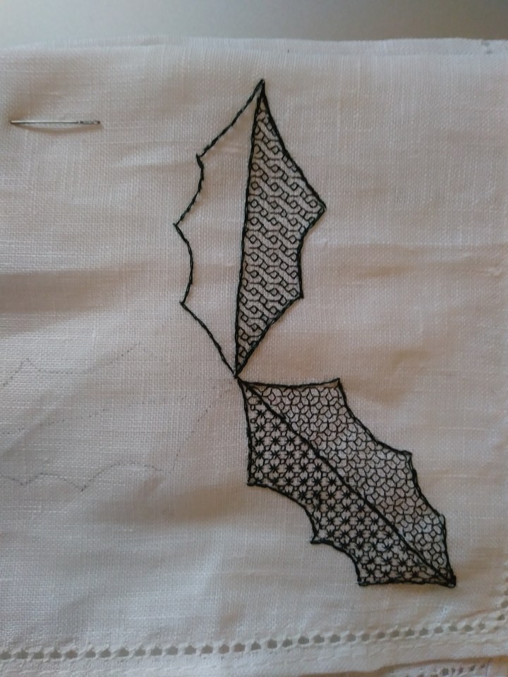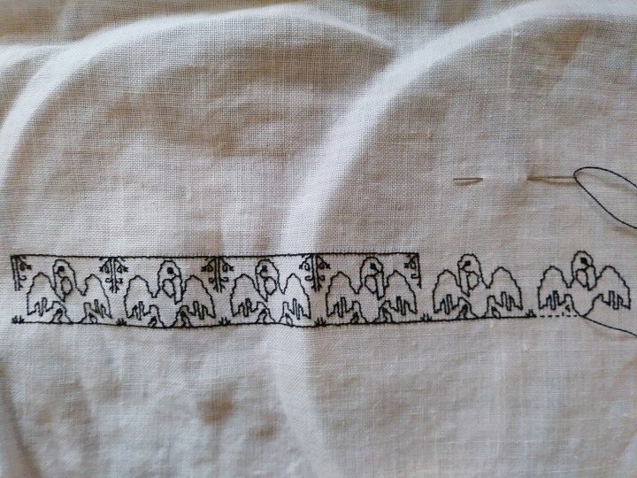 And I’ve been working on T’s project for his elevation to the Order of the Pelican– I’m making a Landsknecht shirt with a blackworked neck band decorated with pelicans in their piety