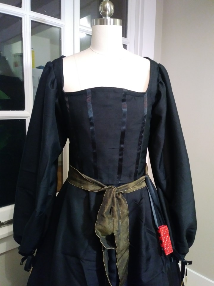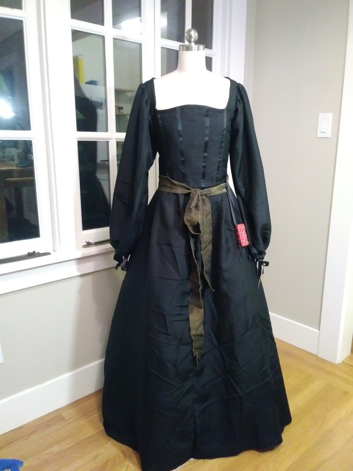 Something about the neckline is not quite right– I feel like the corners should be sharper, if that makes sense? But on the whole I’m happy with it. By March Crown I should have a new cofia y tranzado as well as a 16th C Spanish dragon pendant replica! I shall be actually accessorized and very snazzy.
