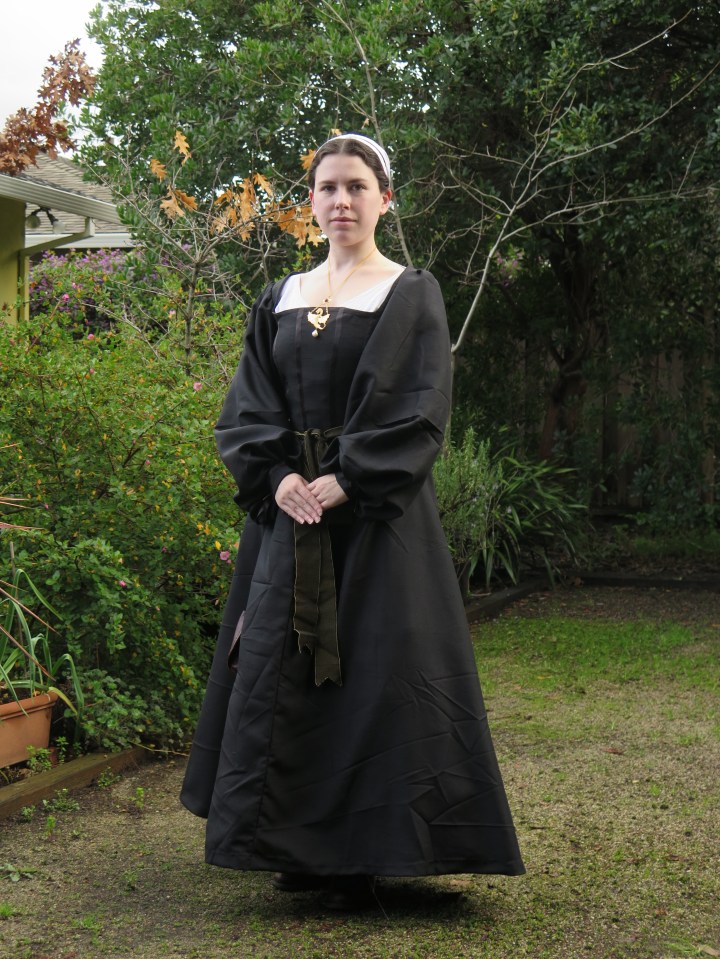 I finally have a Spanish 1520s dress! If you’ve been around for a while you may remember that I started planning one about a year ago– initially for Great Western War, then Twelfth Night before I fell for that damask velvet.