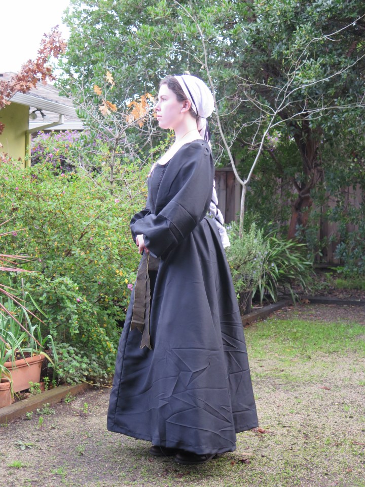 Here I’m wearing it over my spazzy farthingale but looking back at my references it looks like farthingales were not commonly worn by middle class Spanish women in the 1520s, so I might just replace it with a heavy canvas petticoat. I think the farthingale is why the skirt is | \ shaped.