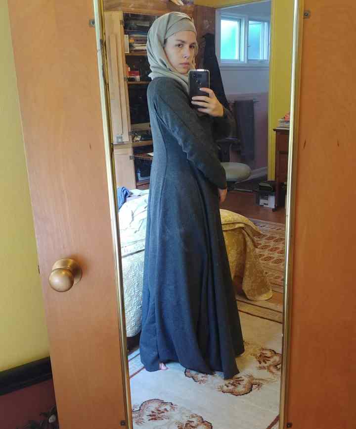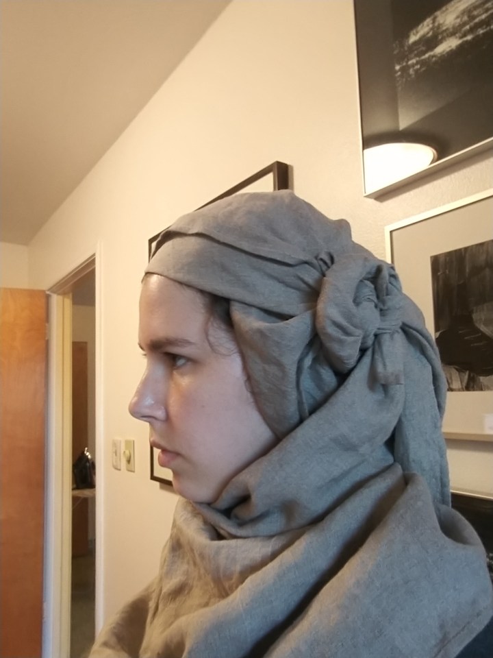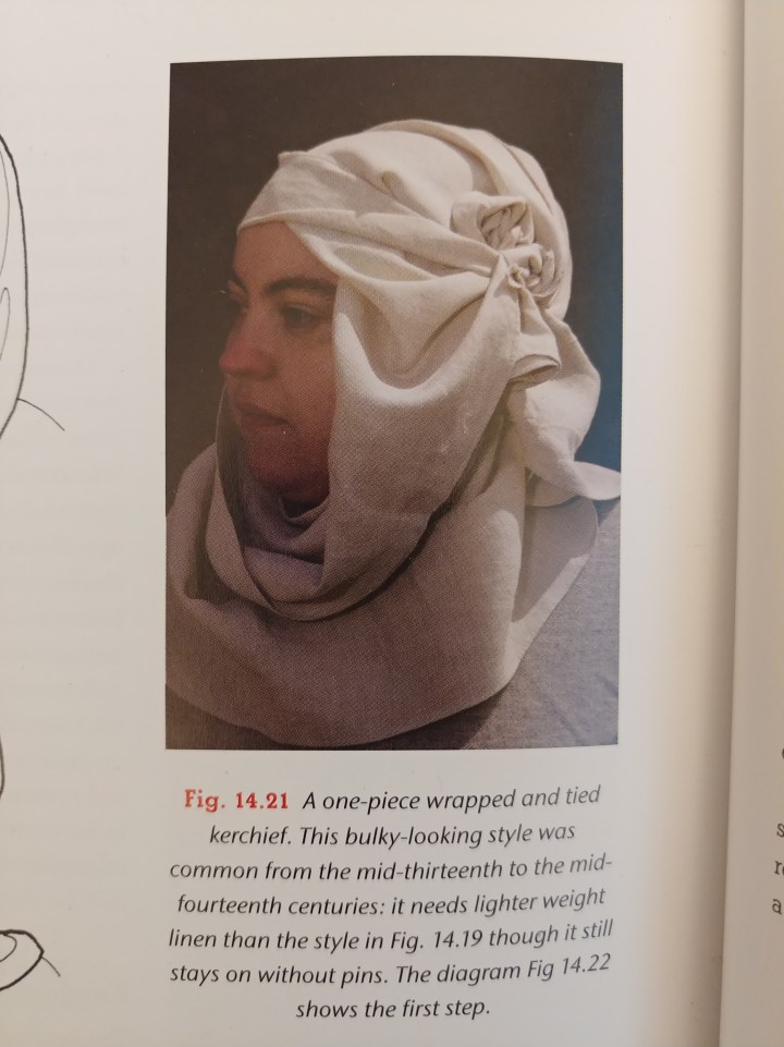 I also wanted to play with some different wrapped veil styles. Because I was using a sheep’s colored wool this was a lower-class outfit immediately, so I wanted something that didn’t require pins.I’ve always liked this style from the Medieval Tailor’s Assistant