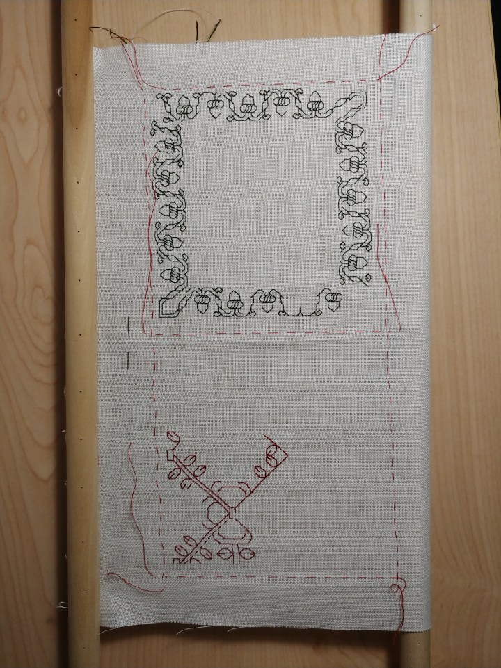 The green motif is from my favorite T.14.1931 sampler and the red is from the Jane Bostocke sampler. The acorns and the flower lattice make it really Western and echoes our crowns, so that’s cool. I’ve got some gold silk coming from Pipers so the second one will hopefully be green and gold.